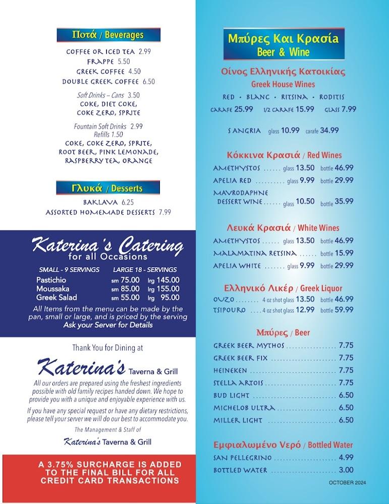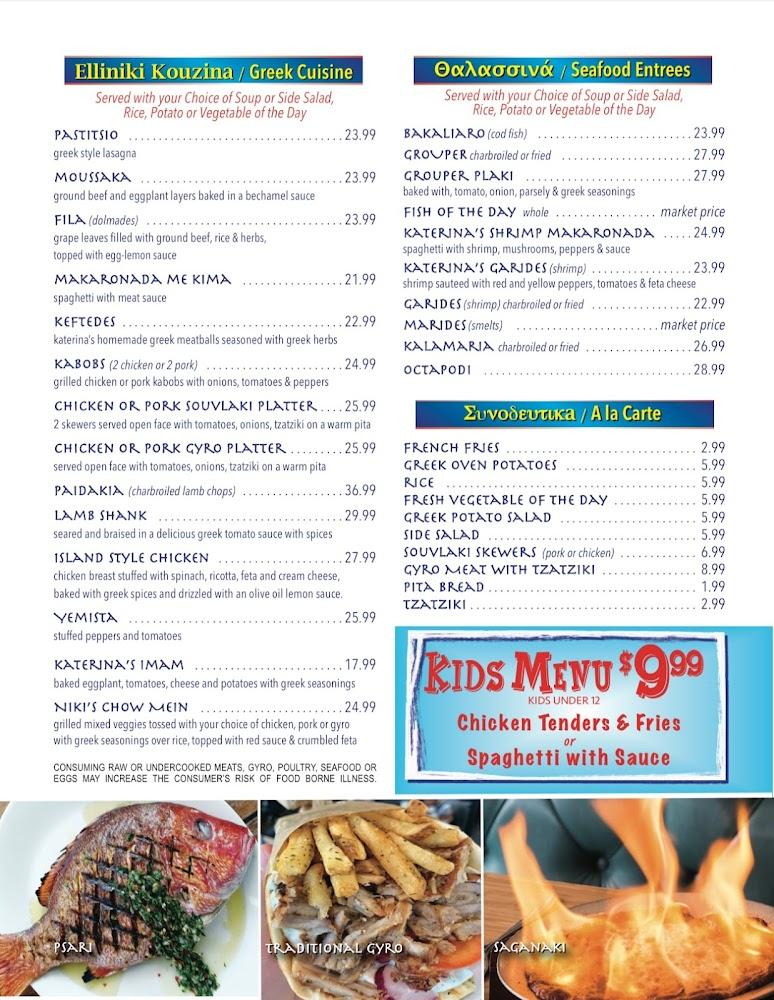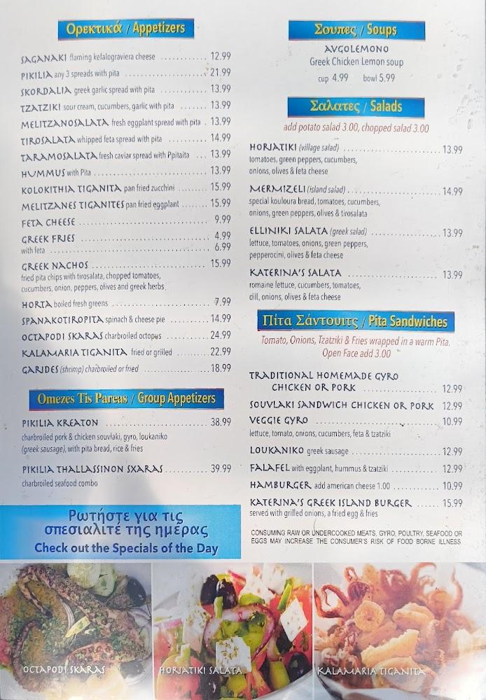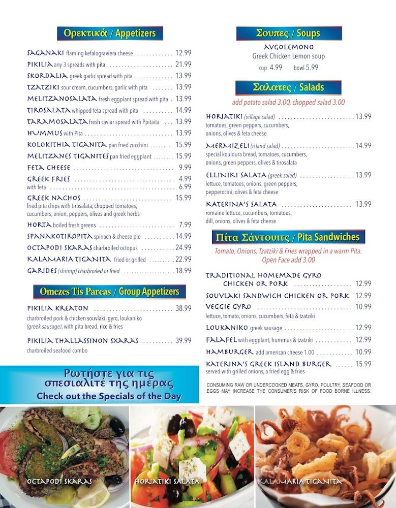 Katerina's menu showcases a variety of Greek cuisine. Choices range from savory appetizers to hearty entrees. Starters such as tzatziki and saganaki warm up the palate beautifully.